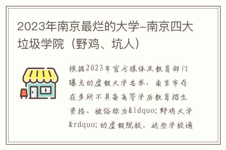 根据2023年官方媒体及教育部门曝光的虚假大学名单,南京市存在多所不具备高等学历教育招生资格、被俗称为“野鸡大学”的虚假院校。这些学校通常通过仿冒正规高校名称、盗用正规学校信息来骗取学生报考,请广大考生及家长在志愿填报时务必警惕。