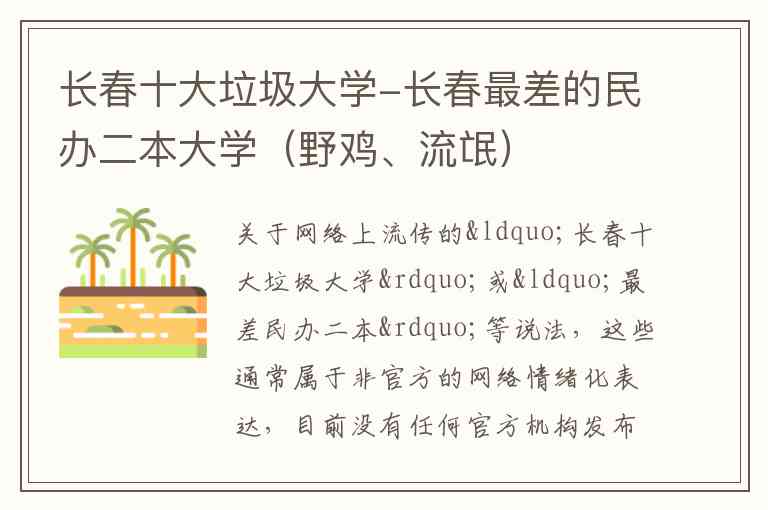 关于网络上流传的“长春十大垃圾大学”或“最差民办二本”等说法,这些通常属于非官方的网络情绪化表达,目前没有任何官方机构发布过此类排名或认定。所谓的“野鸡大学”特指未经教育部门审批、不具备招生资格、通过欺诈手段招生的虚假学校,与正规民办高校有本质区别。