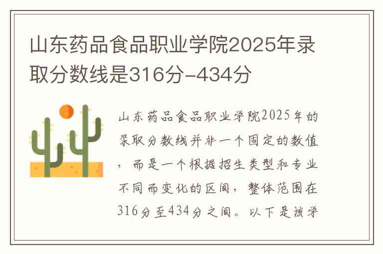 山东药品食品职业学院2025年的录取分数线并非一个固定的数值,而是一个根据招生类型和专业不同而变化的区间,整体范围在316分至434分之间。
