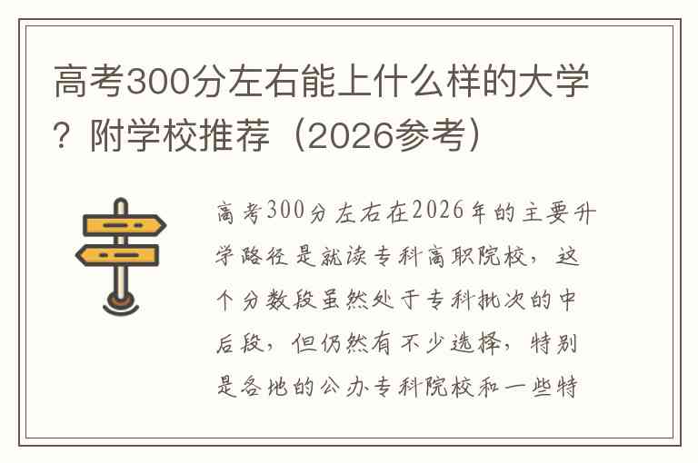 高考300分左右在2026年的主要升学路径是就读专科高职院校,这个分数段虽然处于专科批次的中后段,但仍然有不少选择,特别是各地的公办专科院校和一些特色民办院校。以下是针对不同情况的学校推荐和报考建议。