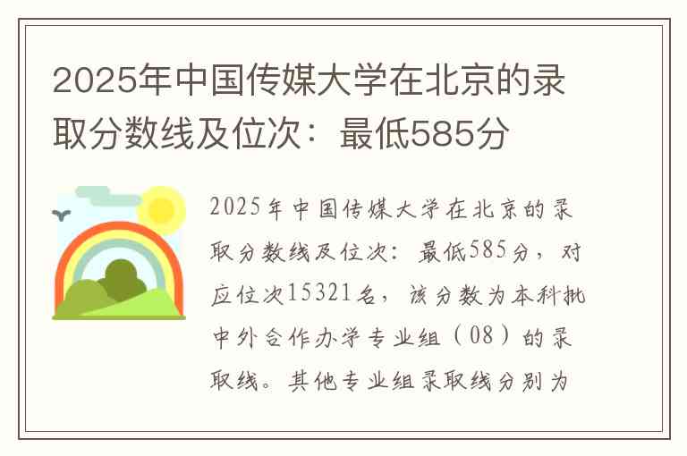 2025年中国传媒大学在北京的录取分数线及位次:最低585分,对应位次15321名,该分数为本科批中外合作办学专业组(08)的录取线。其他专业组录取线分别为:专业组(06)631分(位次5919)、专业组(02)628分(位次6399)、专业组(04)625分(位次6896)、专业组(03)623分(位次7249)、专业组(01)622分(位次7440)、专业组(07)618分(位次8158)、专业组(05)617分(位次8325)、本科提前批A段专业组(10)611分(位次9523)。