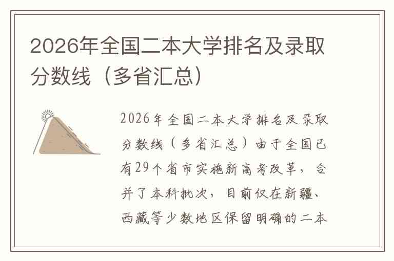 由于全国已有29个省市实施新高考改革,合并了本科批次,目前仅在新疆、西藏等少数地区保留明确的二本招生批次。以下信息基于2025年录取数据整理,供2026年考生参考。