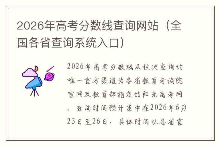 2026年高考分数线及位次查询的唯一官方渠道为各省教育考试院官网及教育部指定的阳光高考网。查询时间预计集中在2026年6月23日至26日,具体时间以各省官方公布为准。