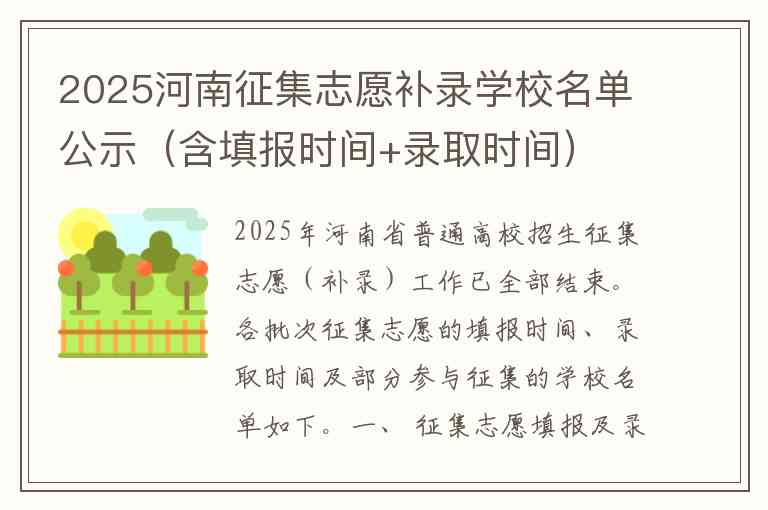 2025年河南省普通高校招生征集志愿(补录)工作已全部结束。各批次征集志愿的填报时间、录取时间及部分参与征集的学校名单如下。