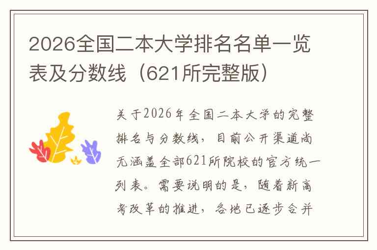 关于2026年全国二本大学的完整排名与分数线,目前公开渠道尚无涵盖全部621所院校的官方统一列表。需要说明的是,随着新高考改革的推进,各地已逐步合并本科录取批次,传统的“二本”概念正在淡化,院校的实际录取分数线也因省份、首选科目(物理/历史)及专业组的不同而差异显著。
