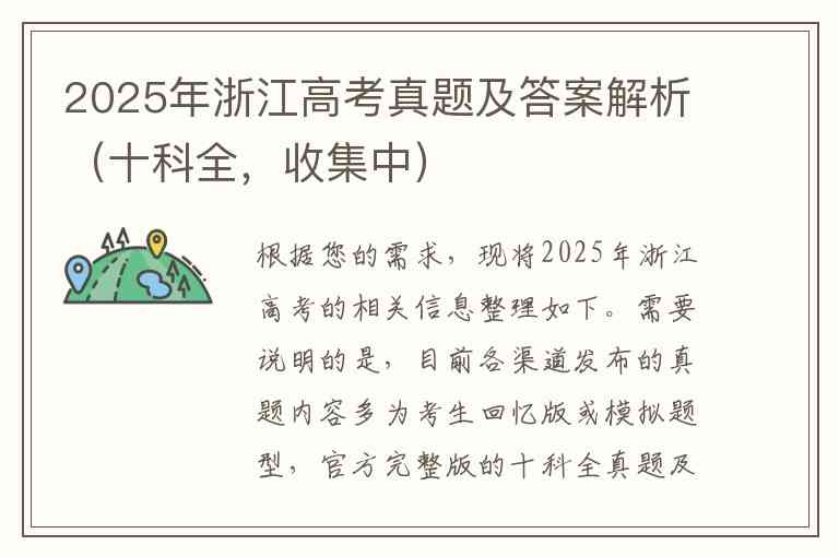 根据您的需求,现将2025年浙江高考的相关信息整理如下。需要说明的是,目前各渠道发布的真题内容多为考生回忆版或模拟题型,官方完整版的十科全真题及答案解析仍在收集中。