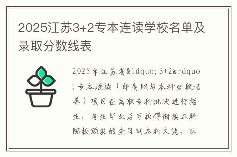 2025年江苏省“3+2”专本连读(即高职与本科分段培养)项目在高职专科批次进行招生,考生毕业后可获得衔接本科院校颁发的全日制本科文凭。