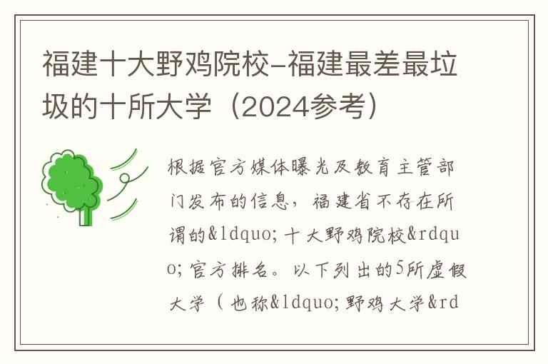 根据官方媒体曝光及教育主管部门发布的信息,福建省不存在所谓的“十大野鸡院校”官方排名。以下列出的5所虚假大学(也称“野鸡大学”)是近年来被《人民日报》等权威媒体曝光、不具备高等学历教育招生资格且不在教育部备案的机构,请广大考生和家长提高警惕。