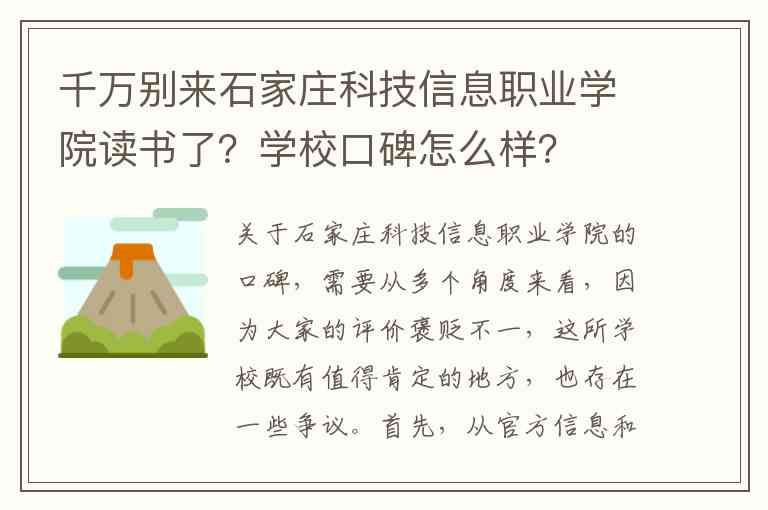 关于石家庄科技信息职业学院的口碑,需要从多个角度来看,因为大家的评价褒贬不一,这所学校既有值得肯定的地方,也存在一些争议。