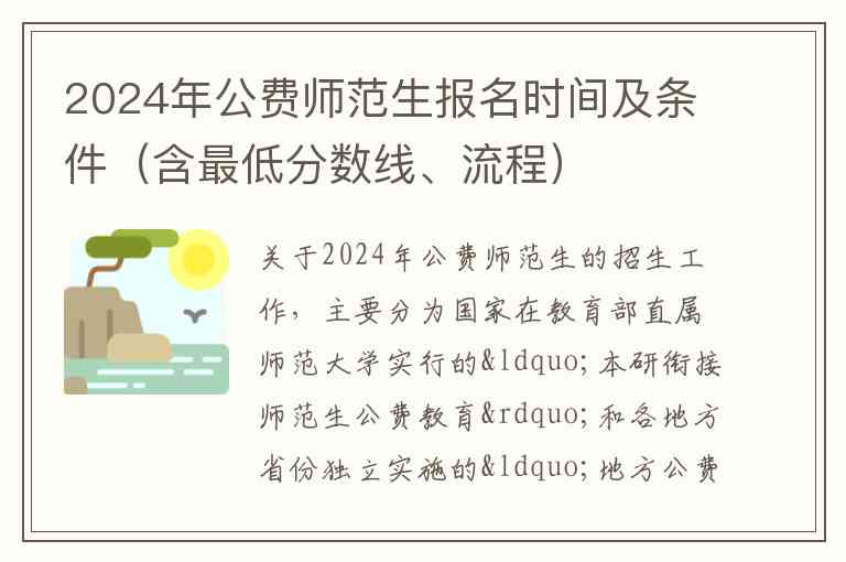 关于2024年公费师范生的招生工作,主要分为国家在教育部直属师范大学实行的“本研衔接师范生公费教育”和各地方省份独立实施的“地方公费师范生”计划。以下根据2024年的政策,从报名时间、条件、最低分数线及流程四个方面进行说明。