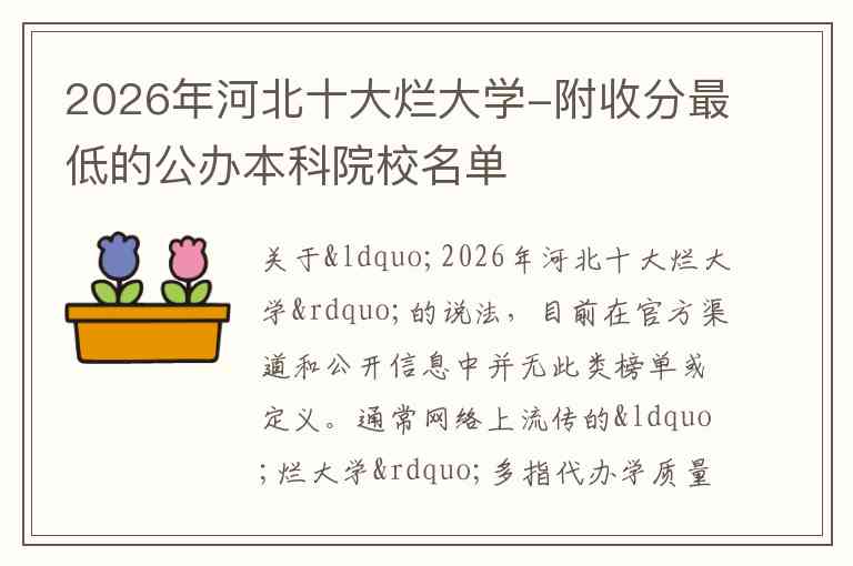 关于“2026年河北十大烂大学”的说法,目前在官方渠道和公开信息中并无此类榜单或定义。通常网络上流传的“烂大学”多指代办学质量不佳、管理混乱或存在违规行为的院校,部分民办高校因资金问题或运营不规范而被提及。