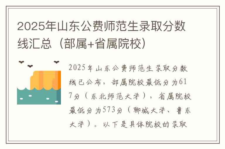 2025年山东公费师范生录取分数线已公布,部属院校最低分为617分(东北师范大学),省属院校最低分为573分(聊城大学、鲁东大学)。以下是具体院校的录取分数线汇总。