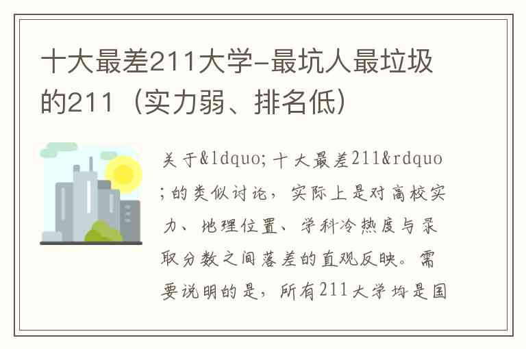关于“十大最差211”的类似讨论,实际上是对高校实力、地理位置、学科冷热度与录取分数之间落差的直观反映。需要说明的是,所有211大学均是国家重点建设高校,拥有远超普通一本的科研平台和保研率,“最差”或“最坑人”通常指以下三类情况:地理位置偏远、学科以冷门基础学科为主、或在同档次211中录取分数线相对较低。
