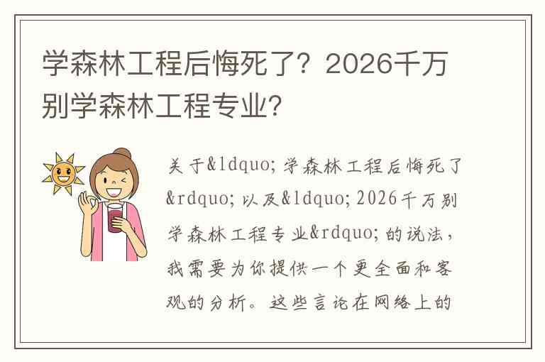 关于“学森林工程后悔死了”以及“2026千万别学森林工程专业”的说法,我需要为你提供一个更全面和客观的分析。这些言论在网络上的确存在,但它们并不能代表这个专业的全貌,其背后的原因也需要理性看待。