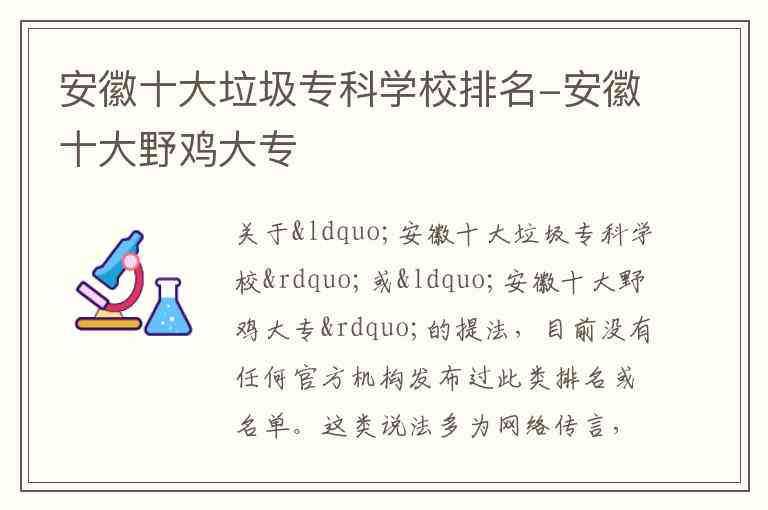 关于“安徽十大垃圾专科学校”或“安徽十大野鸡大专”的提法,目前没有任何官方机构发布过此类排名或名单。这类说法多为网络传言,缺乏权威依据。