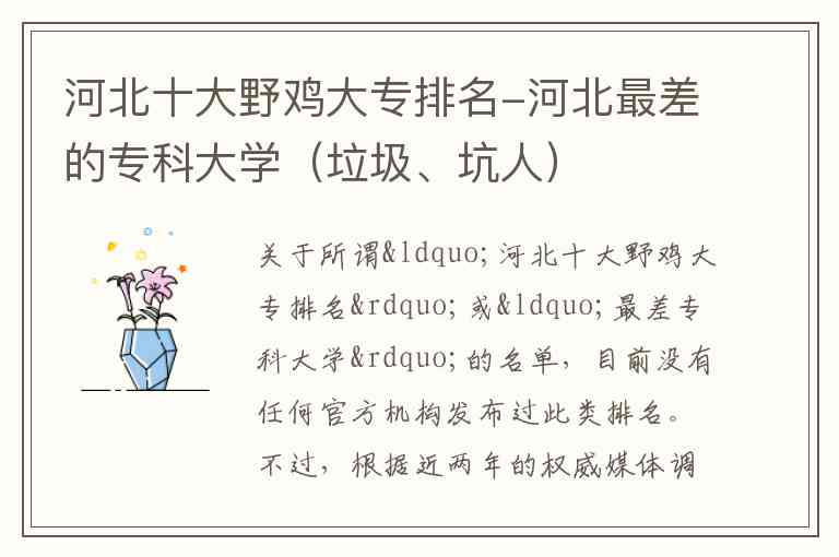 关于所谓“河北十大野鸡大专排名”或“最差专科大学”的名单,目前没有任何官方机构发布过此类排名。不过,根据近两年的权威媒体调查及河北省教育厅、市场监督管理部门的公开处理结果,以下学校在招生过程中存在虚假宣传、违规承诺、学历欺诈等行为,被证实为“野鸡大学”或曾严重侵害学生权益,请考生和家长提高警惕: