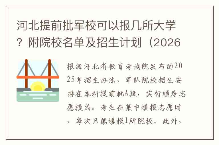 根据河北省教育考试院发布的2025年招生办法,军队院校招生安排在本科提前批A段,实行顺序志愿模式。考生在集中填报志愿时,每次只能填报1所院校。