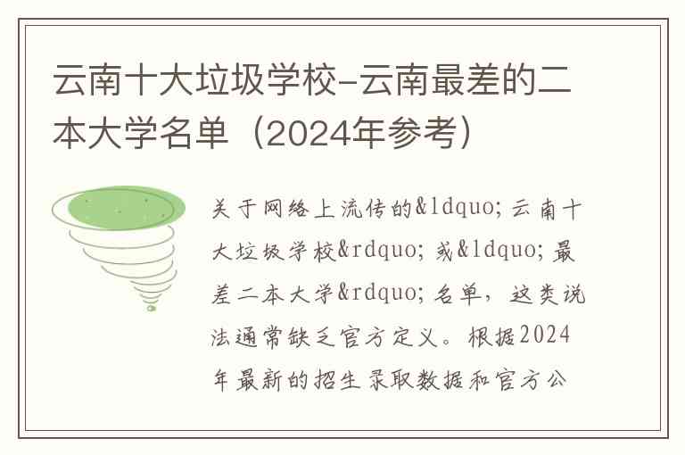 关于网络上流传的“云南十大垃圾学校”或“最差二本大学”名单,这类说法通常缺乏官方定义。根据2024年最新的招生录取数据和官方公布的办学信息,以下为您整理出在云南省内录取分数线相对靠后的二本院校,以及被官方认定为“虚假大学”的名单,供您参考。