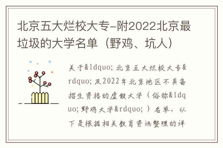 关于“北京五大烂校大专”及2022年北京地区不具备招生资格的虚假大学(俗称“野鸡大学”)名单,以下是根据相关教育资讯整理的详细信息。