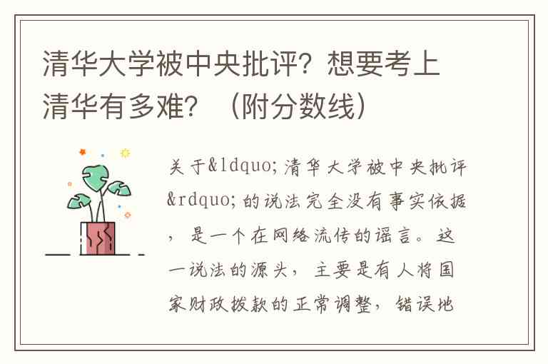 关于“清华大学被中央批评”的说法完全没有事实依据,是一个在网络流传的谣言。这一说法的源头,主要是有人将国家财政拨款的正常调整,错误地解读为中央对学校的不满,但这种解读是毫无根据的。事实上,清华大学作为我国顶尖的高等学府,在各项世界大学排名中表现卓越,拥有数量众多的国家重点学科和高水平A类学科,一直以来都受到国家的高度重视和重点支持。