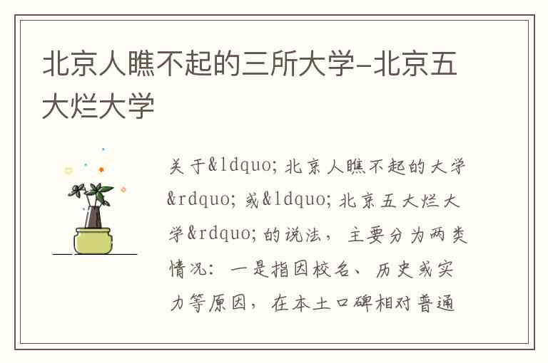 关于“北京人瞧不起的大学”或“北京五大烂大学”的说法,主要分为两类情况:一是指因校名、历史或实力等原因,在本土口碑相对普通的非“双一流”公办大学;二是指被官方媒体曝光过的、不具备招生资格的虚假大学(野鸡大学)。