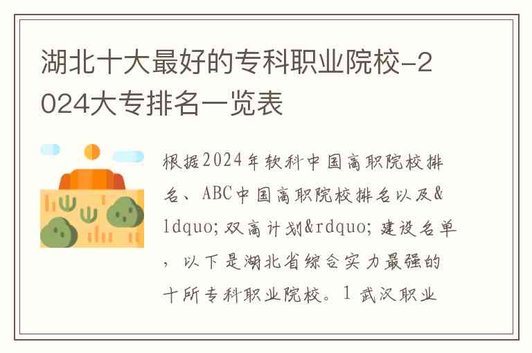 根据2024年软科中国高职院校排名、ABC中国高职院校排名以及“双高计划”建设名单,以下是湖北省综合实力最强的十所专科职业院校。