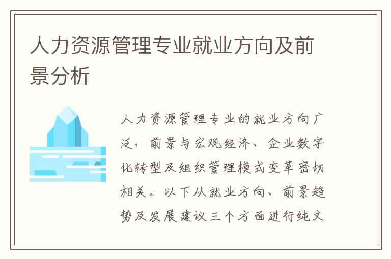 人力资源管理专业的就业方向广泛,前景与宏观经济、企业数字化转型及组织管理模式变革密切相关。以下从就业方向、前景趋势及发展建议三个方面进行纯文字分析。