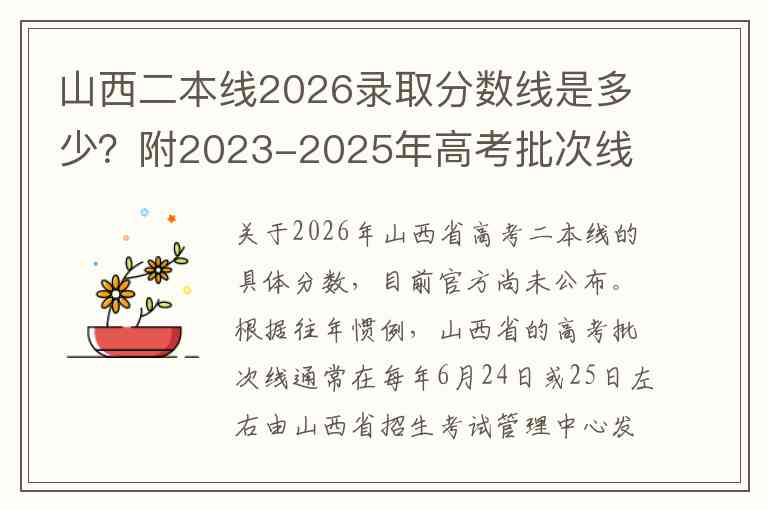 关于2026年山西省高考二本线的具体分数,目前官方尚未公布。根据往年惯例,山西省的高考批次线通常在每年6月24日或25日左右由山西省招生考试管理中心发布。
