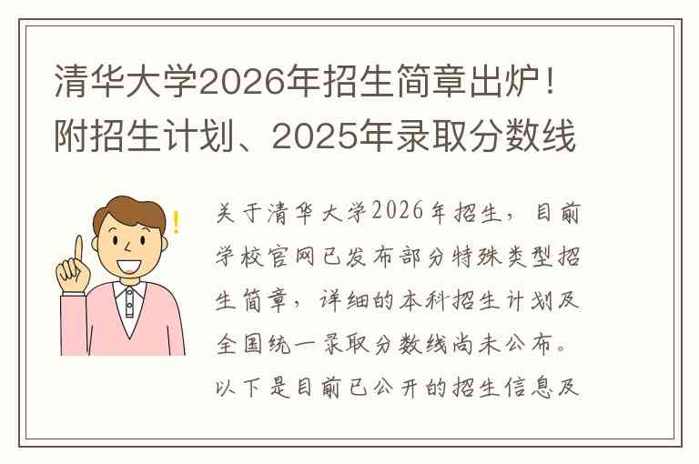 关于清华大学2026年招生,目前学校官网已发布部分特殊类型招生简章,详细的本科招生计划及全国统一录取分数线尚未公布。以下是目前已公开的招生信息及2025年录取数据参考。