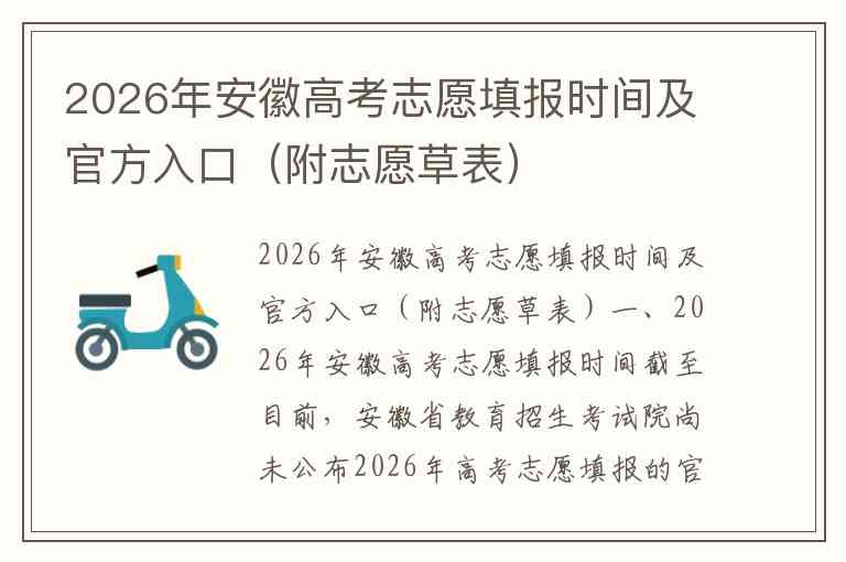 截至目前,安徽省教育招生考试院尚未公布2026年高考志愿填报的官方时间。以下根据往年安排及已发布信息整理,供考生和家长参考,最终时间请以官方最新通知为准。