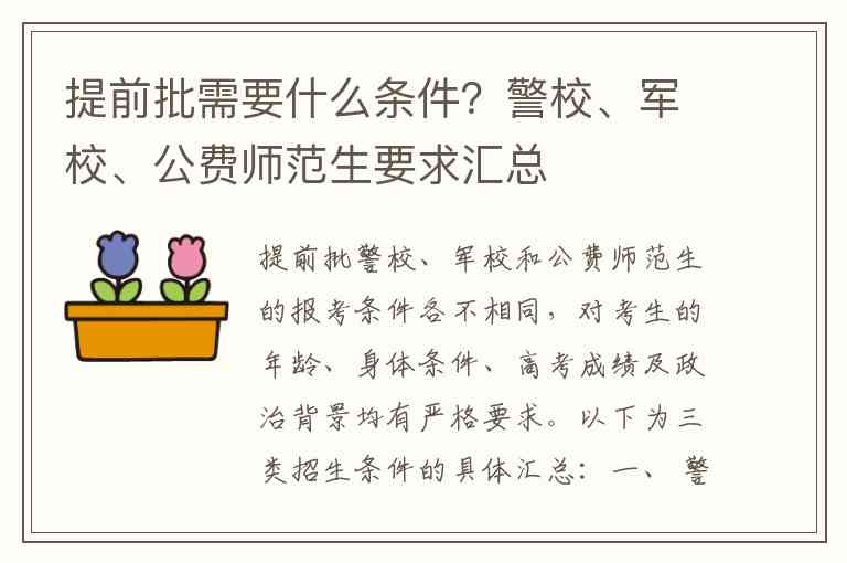 提前批警校、军校和公费师范生的报考条件各不相同,对考生的年龄、身体条件、高考成绩及政治背景均有严格要求。以下为三类招生条件的具体汇总: