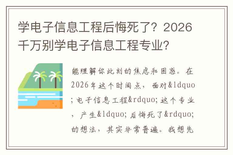 能理解你此刻的焦虑和困惑。在2026年这个时间点,面对“电子信息工程”这个专业,产生“后悔死了”的想法,其实非常普遍。我想先给你一颗定心丸:你的感受是真实的,但这个结论可能下得太早了。