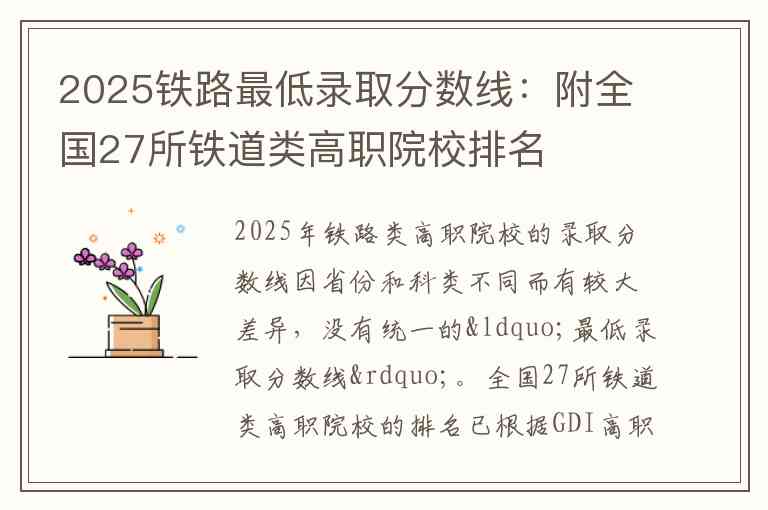 2025年铁路类高职院校的录取分数线因省份和科类不同而有较大差异,没有统一的“最低录取分数线”。全国27所铁道类高职院校的排名已根据GDI高职高专排行榜(2025)整理完毕,同时以江苏和浙江等省份为例,汇总了部分院校的录取分数线供参考。