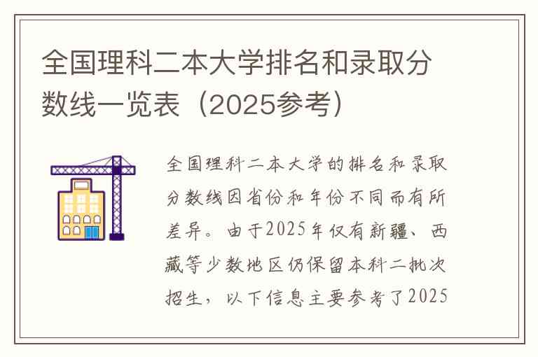 全国理科二本大学的排名和录取分数线因省份和年份不同而有所差异。由于2025年仅有新疆、西藏等少数地区仍保留本科二批次招生,以下信息主要参考了2025年新疆的理科投档数据以及软科发布的2025年中国大学排名,供你作为大致参考。