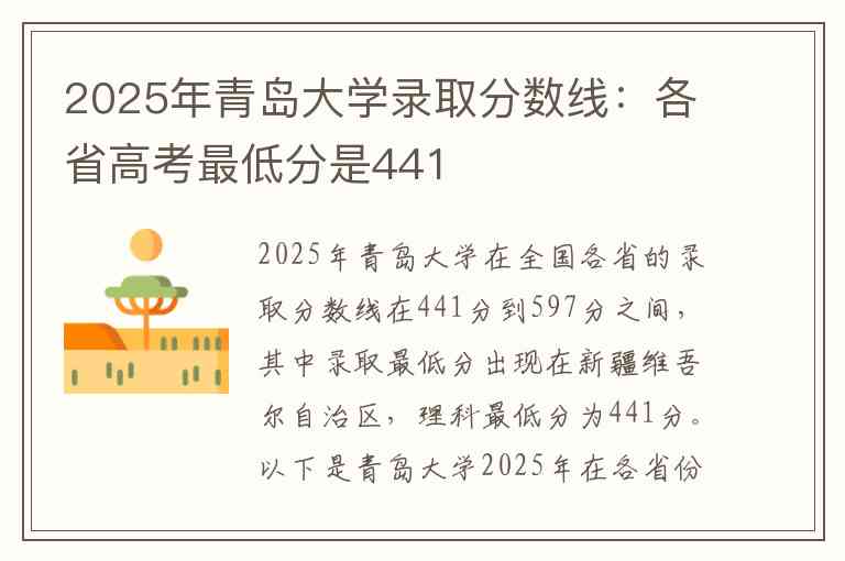 2025年青岛大学在全国各省的录取分数线在441分到597分之间,其中录取最低分出现在新疆维吾尔自治区,理科最低分为441分。