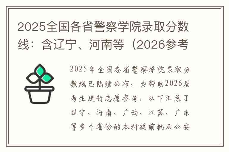 2025年全国各省警察学院录取分数线已陆续公布,为帮助2026届考生进行志愿参考,以下汇总了辽宁、河南、广西、江苏、广东等多个省份的本科提前批及公安类专业最低录取分数线。数据均整理自各省教育考试院及高校官方发布信息。