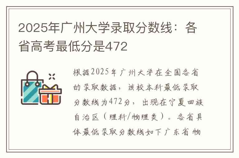 根据2025年广州大学在全国各省的录取数据,该校本科最低录取分数线为472分,出现在宁夏回族自治区(理科/物理类)。各省具体最低录取分数线如下