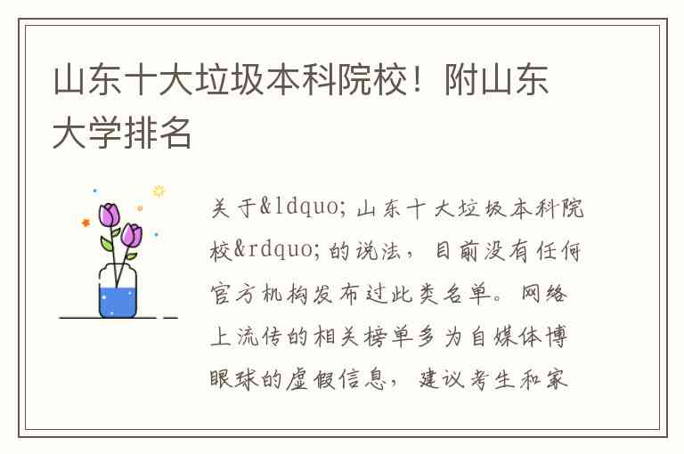 关于“山东十大垃圾本科院校”的说法,目前没有任何官方机构发布过此类名单。网络上流传的相关榜单多为自媒体博眼球的虚假信息,建议考生和家长不要轻信,以免受到误导。