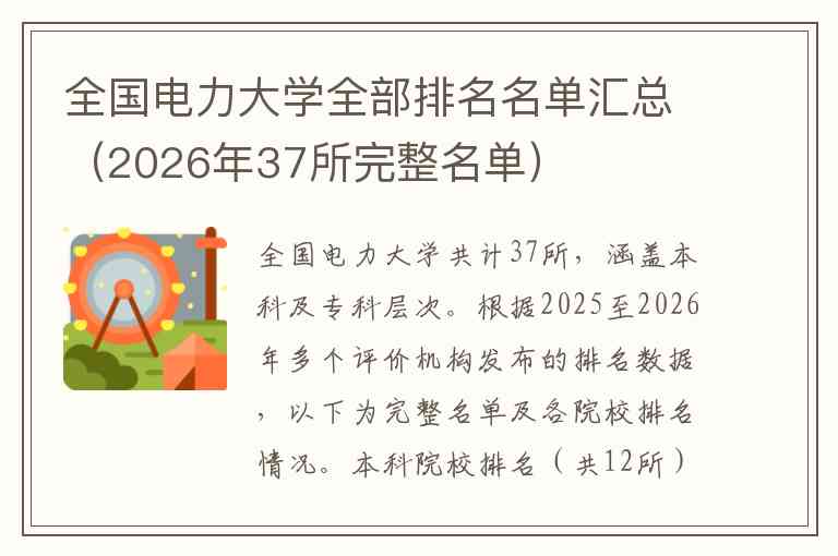 全国电力大学共计37所,涵盖本科及专科层次。根据2025至2026年多个评价机构发布的排名数据,以下为完整名单及各院校排名情况。