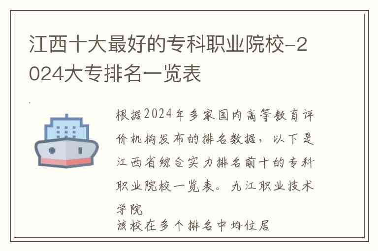 根据2024年多家国内高等教育评价机构发布的排名数据,以下是江西省综合实力排名前十的专科职业院校一览表。