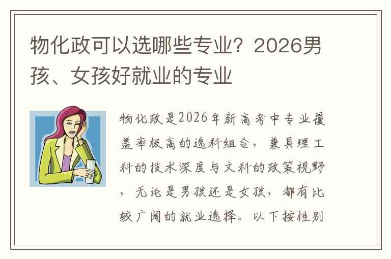 物化政是2026年新高考中专业覆盖率极高的选科组合,兼具理工科的技术深度与文科的政策视野,无论是男孩还是女孩,都有比较广阔的就业选择。以下按性别分类,为你整理了就业前景较好的专业方向。