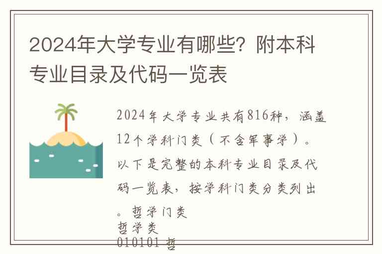 2024年大学专业共有816种,涵盖12个学科门类(不含军事学)。以下是完整的本科专业目录及代码一览表,按学科门类分类列出。