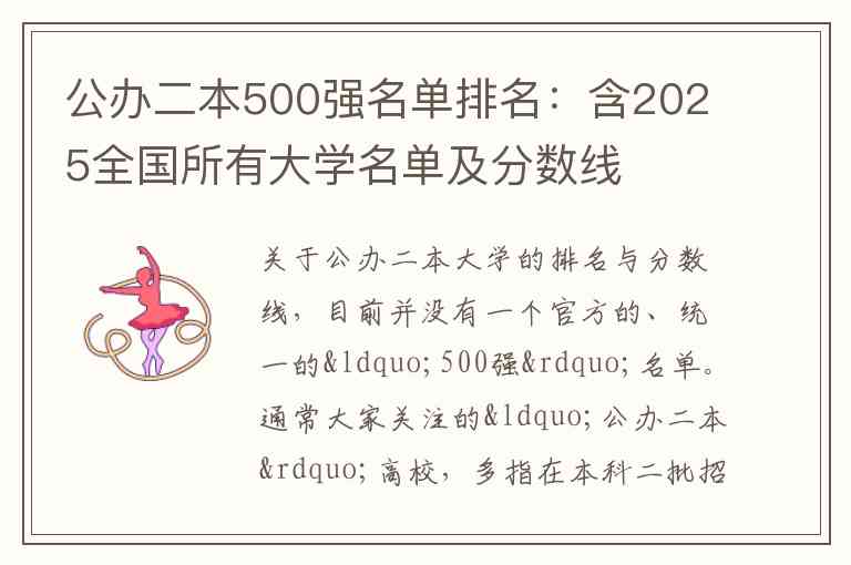 关于公办二本大学的排名与分数线,目前并没有一个官方的、统一的“500强”名单。通常大家关注的“公办二本”高校,多指在本科二批招生,或在新高考省份录取分数位于本科线(一段线)与特殊类型招生控制线之间的公办院校。
