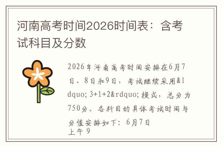 2026年河南高考时间安排在6月7日、8日和9日,考试继续采用“3+1+2”模式,总分为750分。
