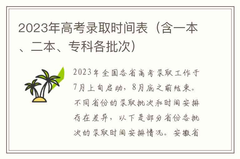2023年全国各省高考录取工作于7月上旬启动,8月底之前结束。不同省份的录取批次和时间安排存在差异,以下是部分省份各批次的录取时间安排情况。