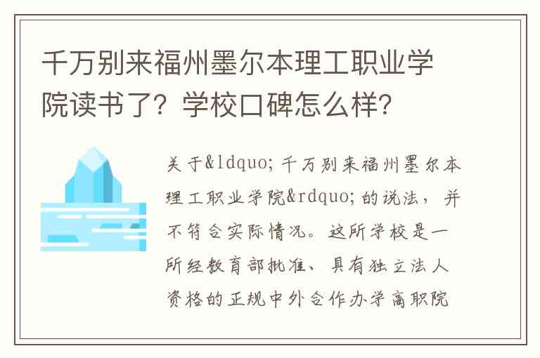 关于“千万别来福州墨尔本理工职业学院”的说法,并不符合实际情况。这所学校是一所经教育部批准、具有独立法人资格的正规中外合作办学高职院校,办学历史已超过20年,并非网络传言中的“野鸡大学”。其口碑呈现出鲜明的两面性,对于适合的学生群体来说是很好的选择,但对另一些人则可能不太匹配。