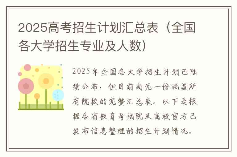 2025年全国各大学招生计划已陆续公布,但目前尚无一份涵盖所有院校的完整汇总表。以下是根据各省教育考试院及高校官方已发布信息整理的招生计划情况。