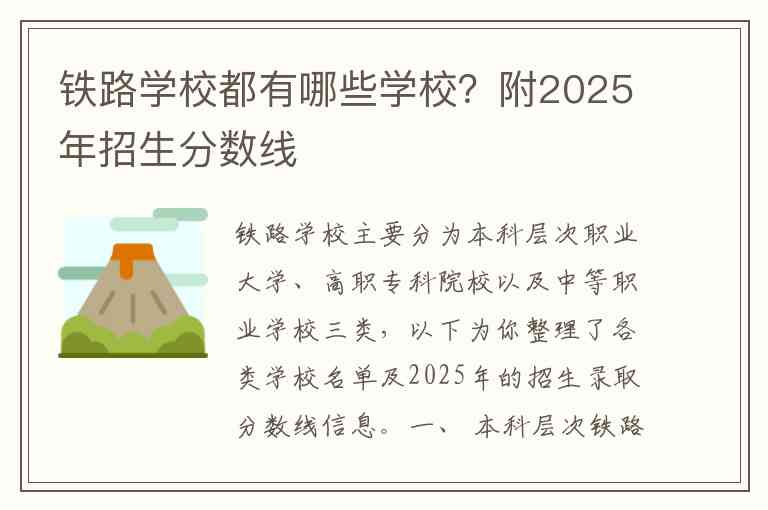 铁路学校主要分为本科层次职业大学、高职专科院校以及中等职业学校三类,以下为你整理了各类学校名单及2025年的招生录取分数线信息。