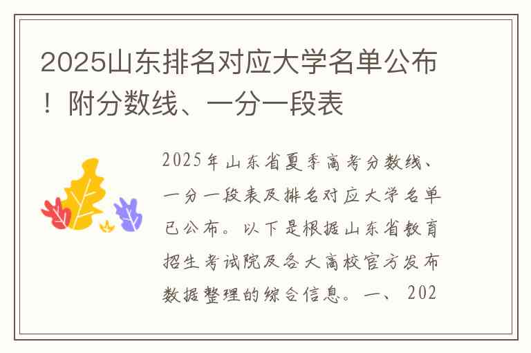 2025年山东省夏季高考分数线、一分一段表及排名对应大学名单已公布。以下是根据山东省教育招生考试院及各大高校官方发布数据整理的综合信息。