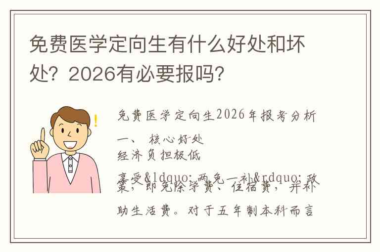 综上所述,免费医学定向生是一个利弊都非常清晰的政策。对于2026年的考生而言,它不是一个适合所有人的“最优解”,而是一个极具针对性的“精准选择”。如果符合你的家庭情况和人生志向,它便是你通往医学道路的坚实阶梯;如果与你的个人追求不符,它也可能成为束缚未来发展的约束。建议你结合自身实际,深思熟虑后再做决定。
